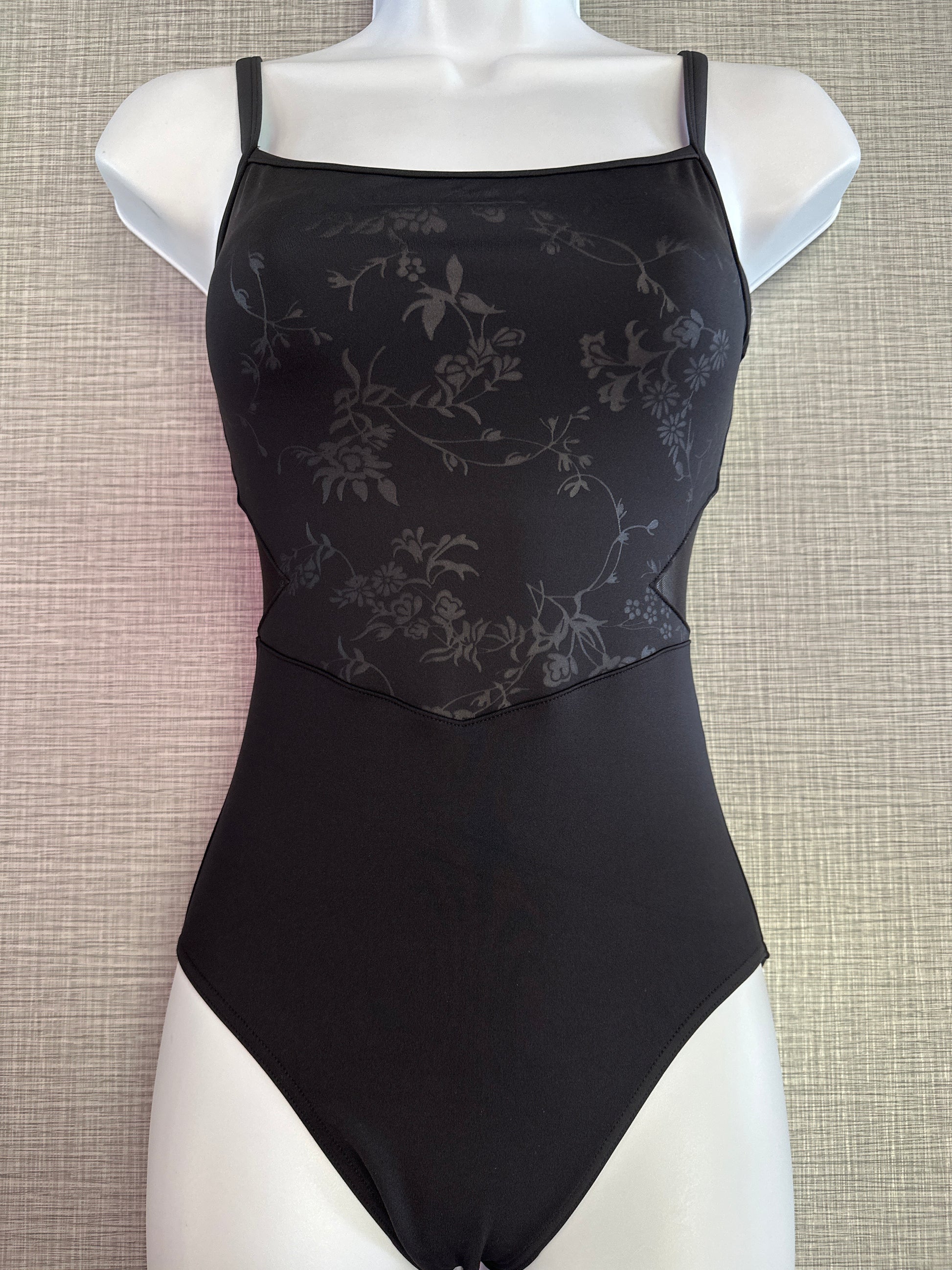 Mesh back tank leotards with embossed floral contrast detail. Fabric: Main-78% Polyester, 22% Elastane Contrast1-78% Polyester, 22% Elastane emboss Contras2-90% Nylon, 10% Elastane mesh
