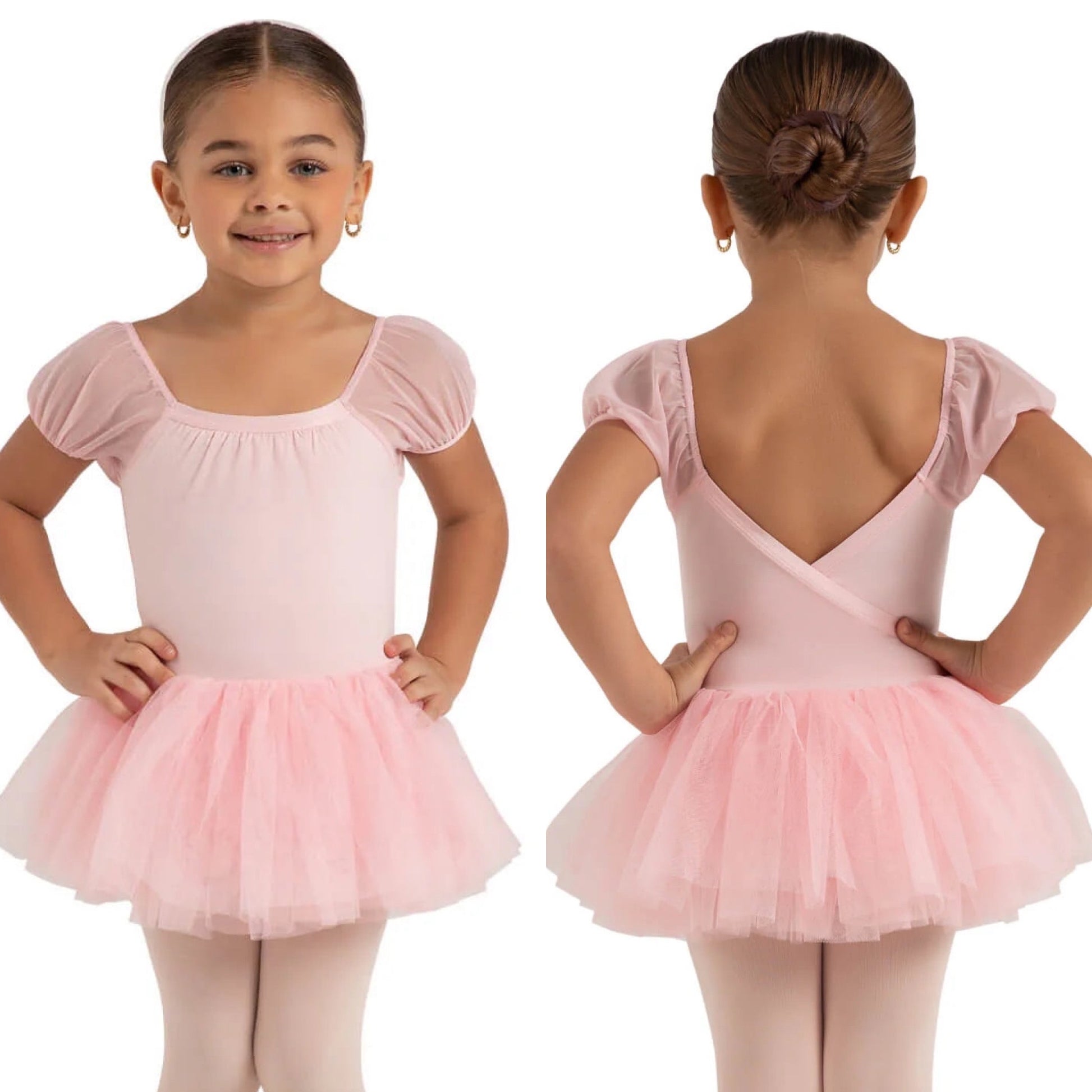 Float across the floor in the Heavenly Tutu Dress, designed to make any young ballerina feel like they're dancing on clouds. Made of a heavenly blend of polyester and spandex, this dress is silky soft, and stretchy, allowing for dreamy dance moves. The mesh is dyed to match, creating a seamless and utterly enchanting ensemble. Featuring a square neckline and chic gathers at the neckline and sleeve, this dress radiates sophistication, while the crossover v-back adds a touch of flair. The three-layer tutu, made of 100% polyester tulle, gives the dress a voluminous and fluffy look that is simply divine. All colors come fully front-lined for maximum comfort and modesty. Available in child sizes only.