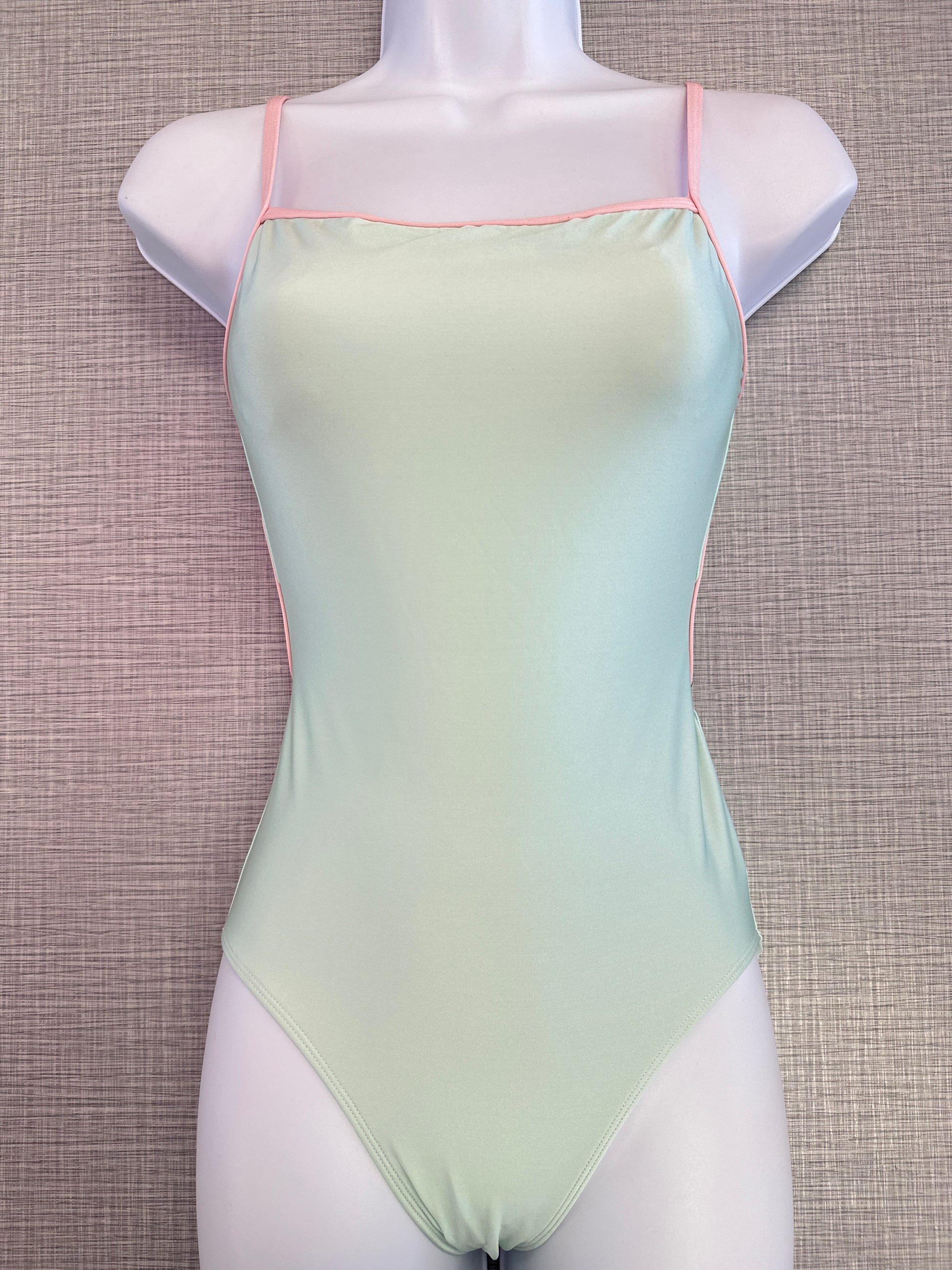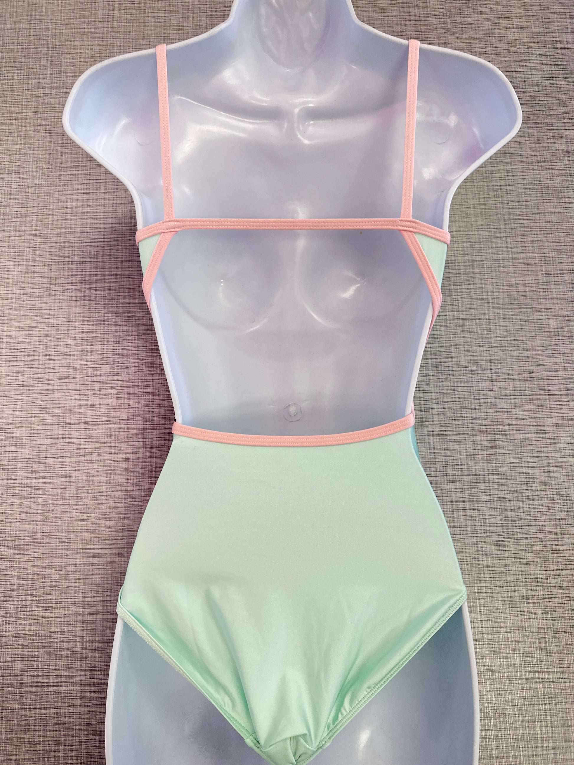 The sporty Candy leotard features cami straps and an open back with a higher cut leg line. Now available in our shiny fabric with shiny trim.