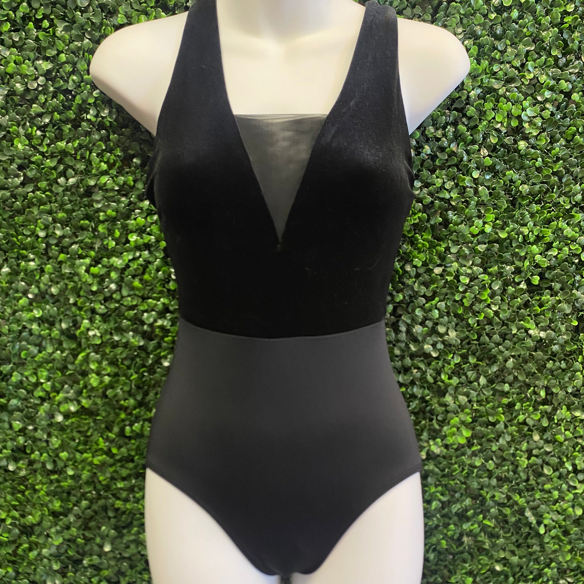 - Center back seam Velvet and mesh are dyed-to-match