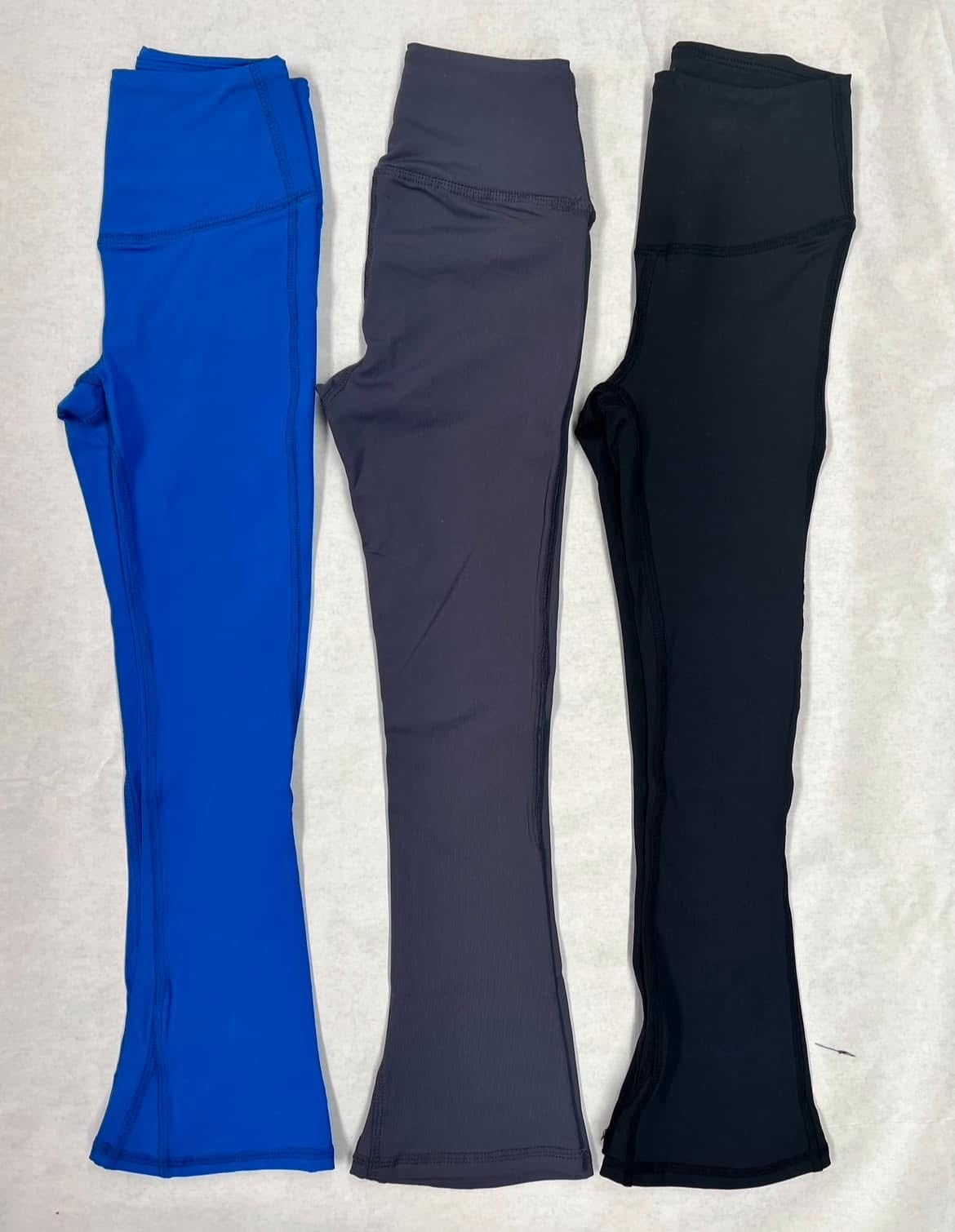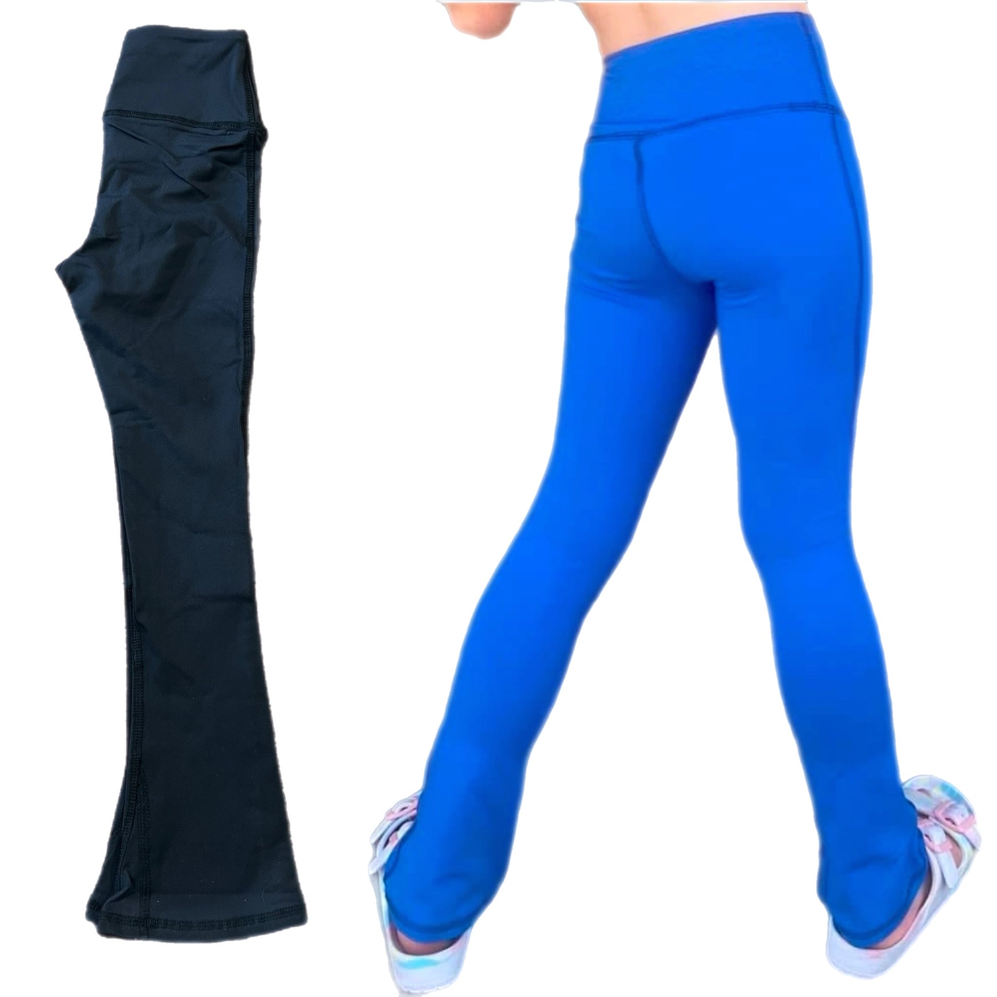 Flare leggings a thick waistband, available in colors and multiple sizes.