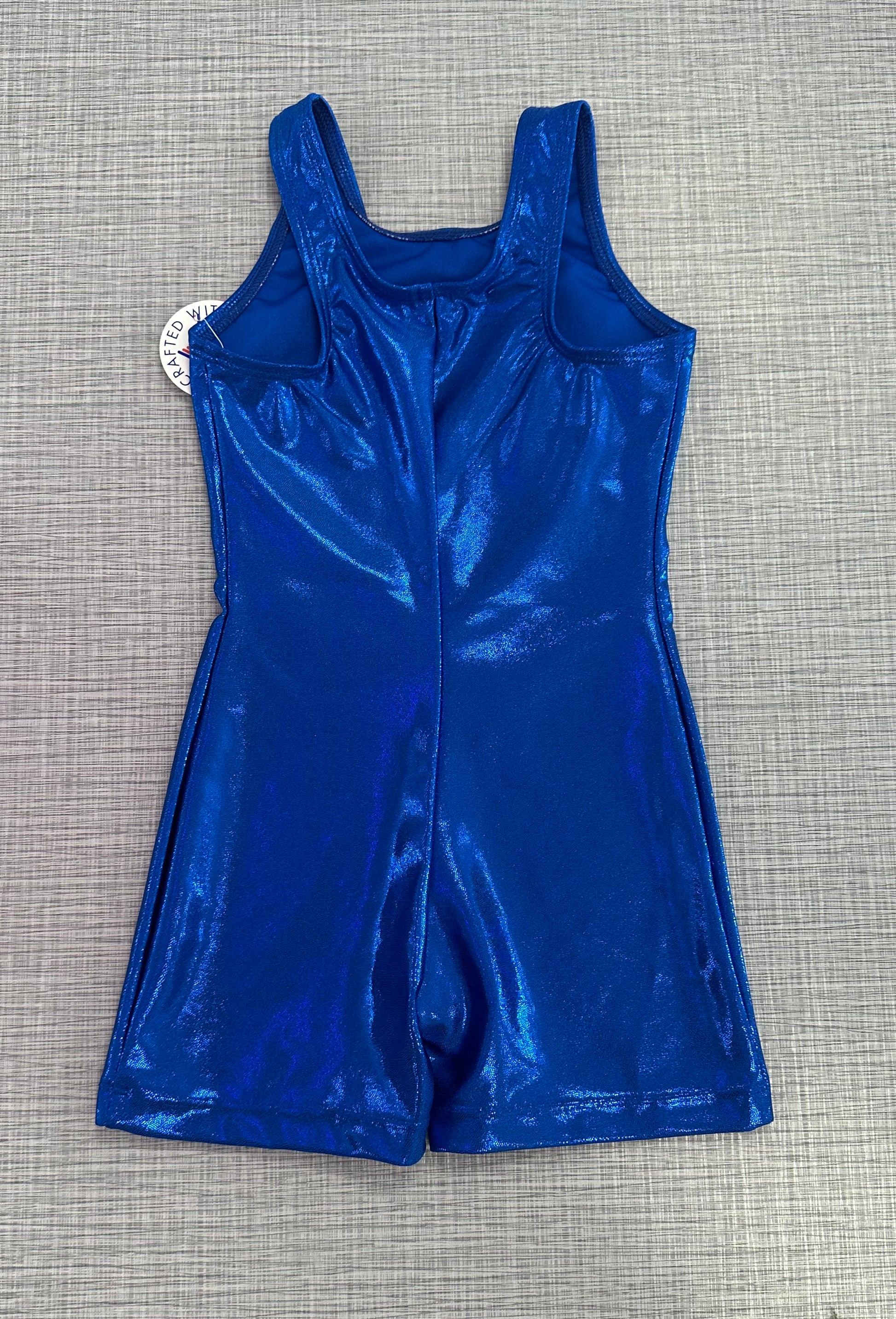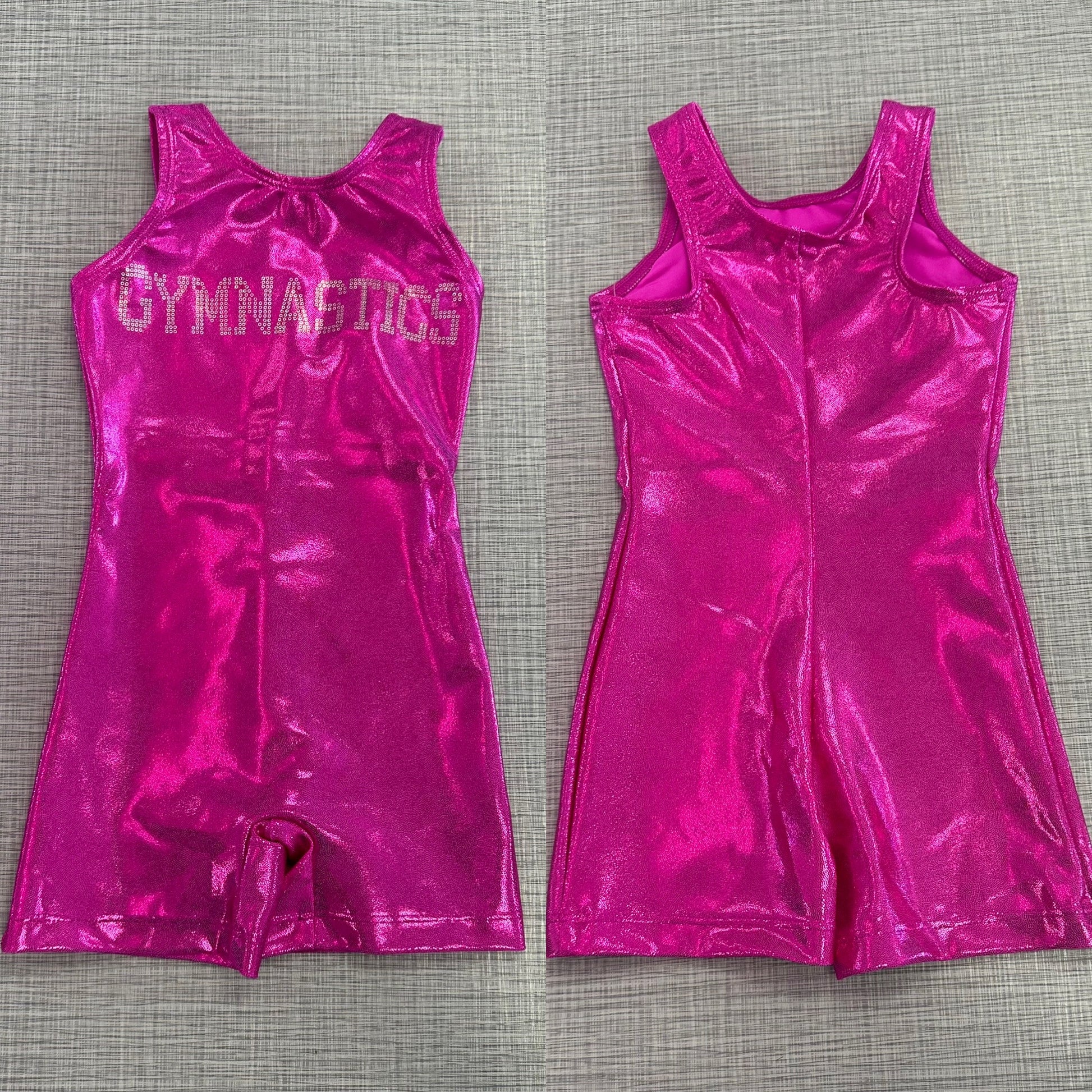 Tank style biketard with gymnatics in rhinestones on the front in a foil finish.