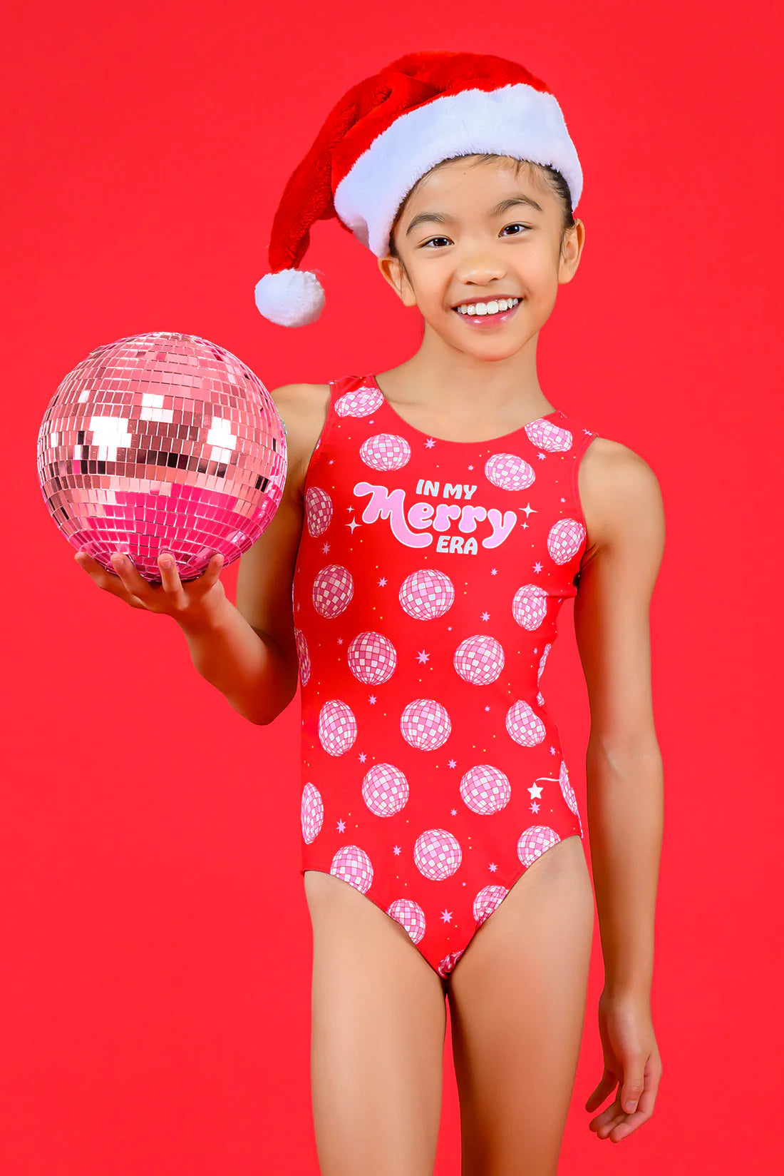 Celebrate the season in style with a stylish red leotard made from buttery soft fabric. This holiday red leotard is decorated with disco balls that bring the festive spirit of the holidays to the gym. The graphic text "In my Merry Era" completed this jolly holiday leotard for girls.