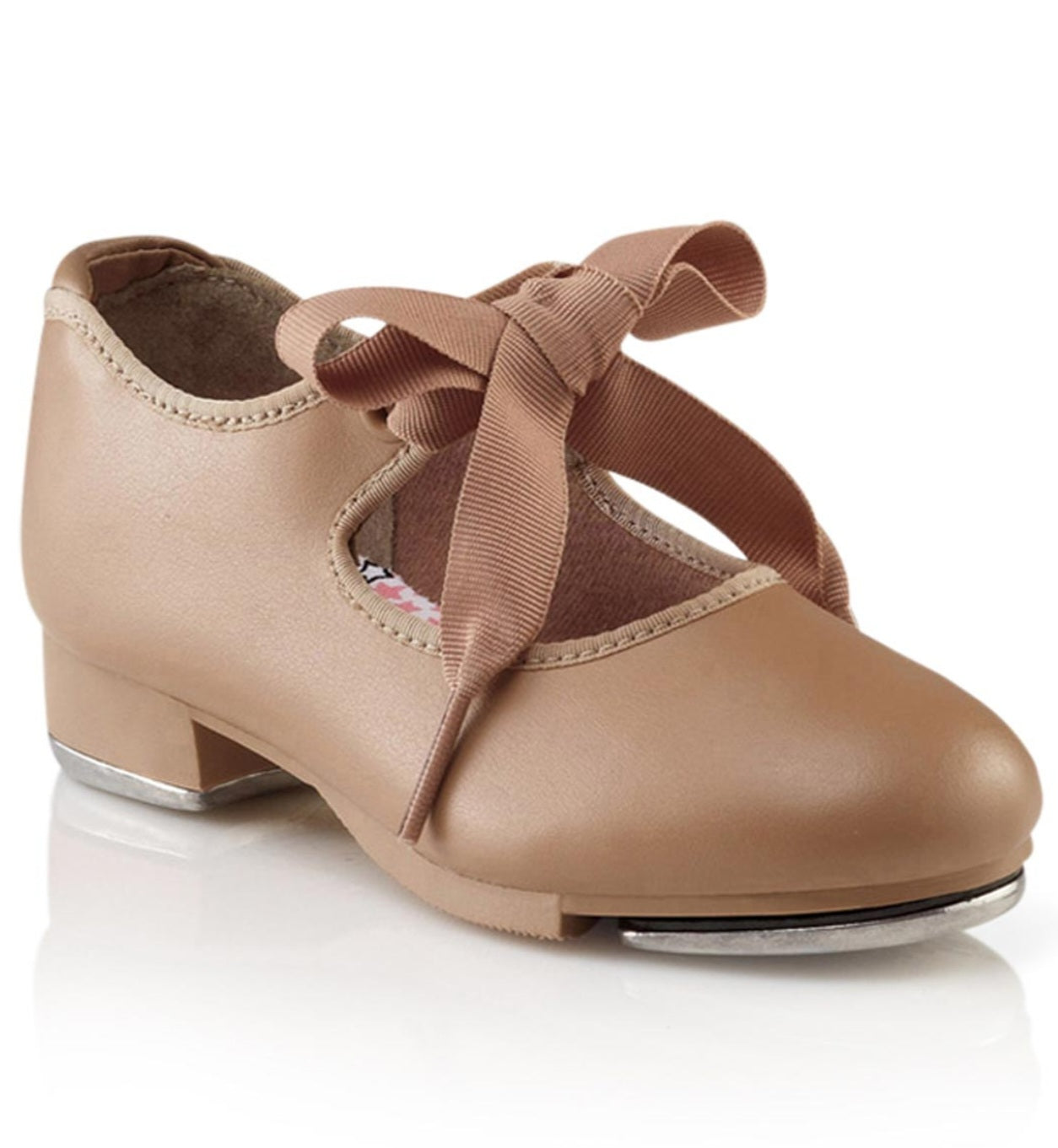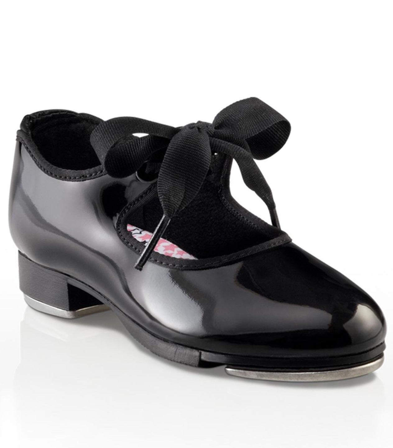 The Jr. Tyette tap shoe is the number one choice for a beginner tapper. Comes in shiny black patent. Adorable ribbon tie and star printed cotton lining will inspire your little dancer to have Broadway sized dreams. Features foam padded footbed, collar and Achilles notch for added comfort and security. Introductory tappers will take their first steps with confidence in the Jr. Tyette.