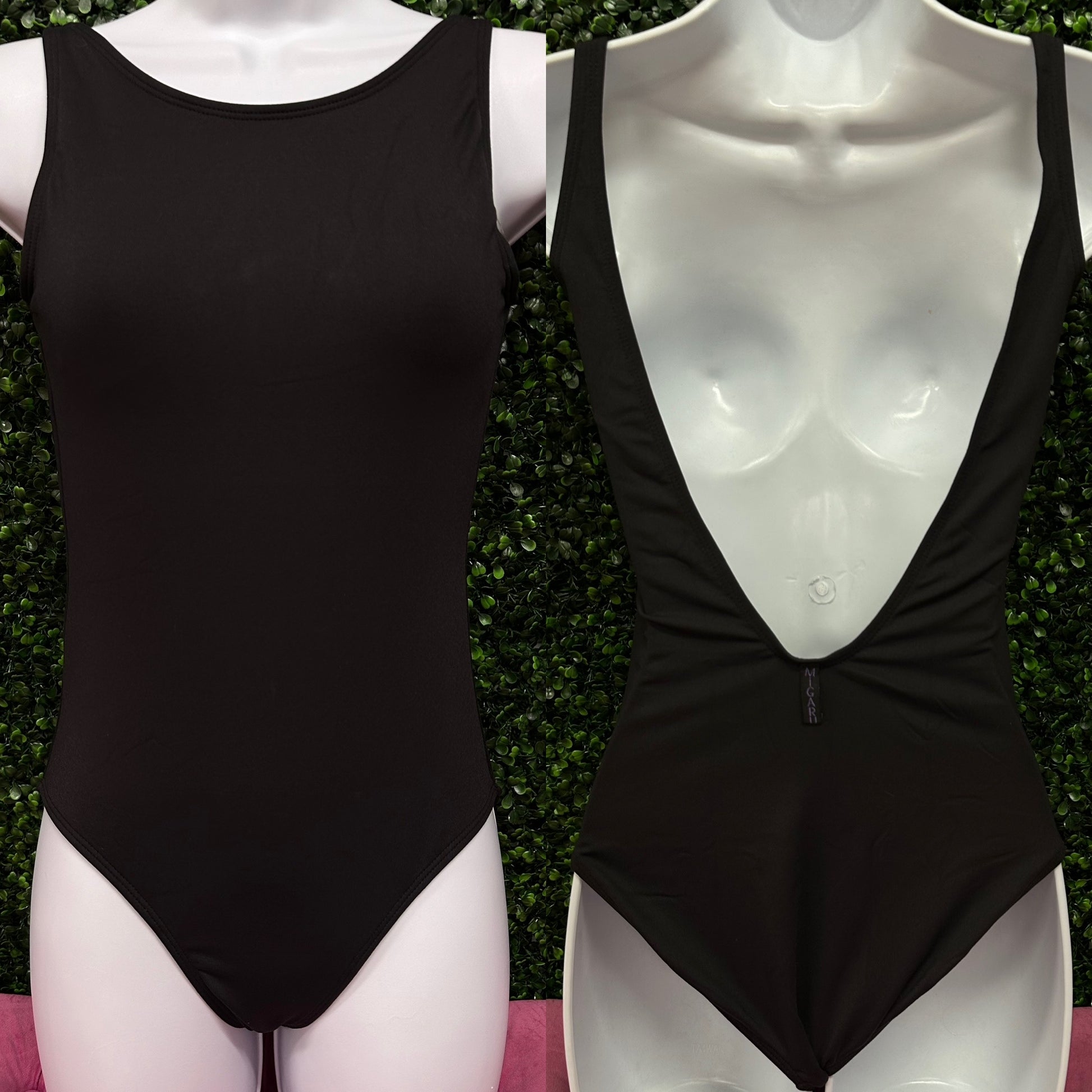 Closed neck front with v shape open back leotard.