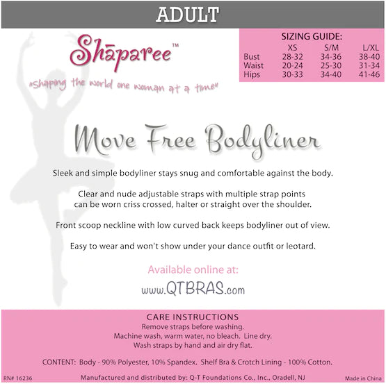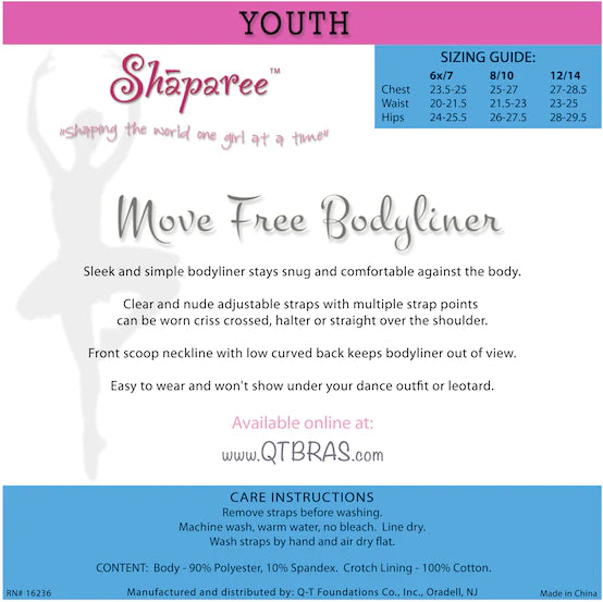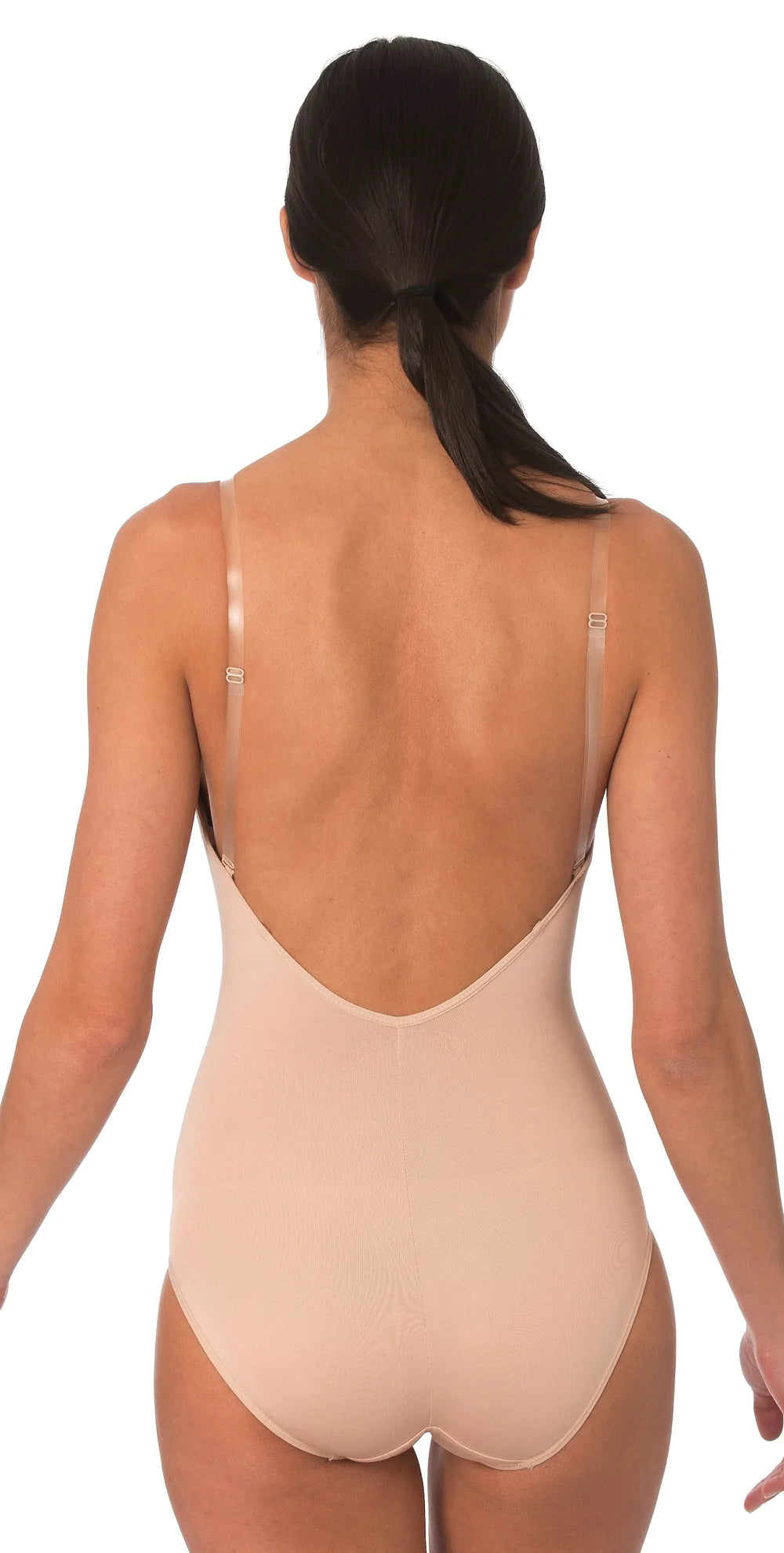 Sleek and simple bodyliner stays snug and comfortable against the body. Clear and nude adjustable straps with multiple strap points can be worn criss crossed, halter or straight over the shoulder. Front scoop neckline with low curved back keeps bodyliner out of view. Easy to wear and won't show under dance outfits or leotard.