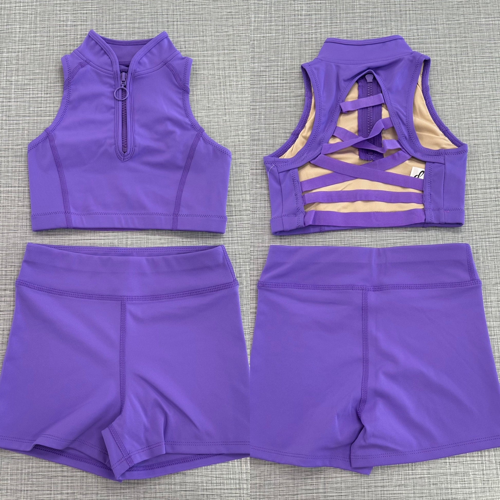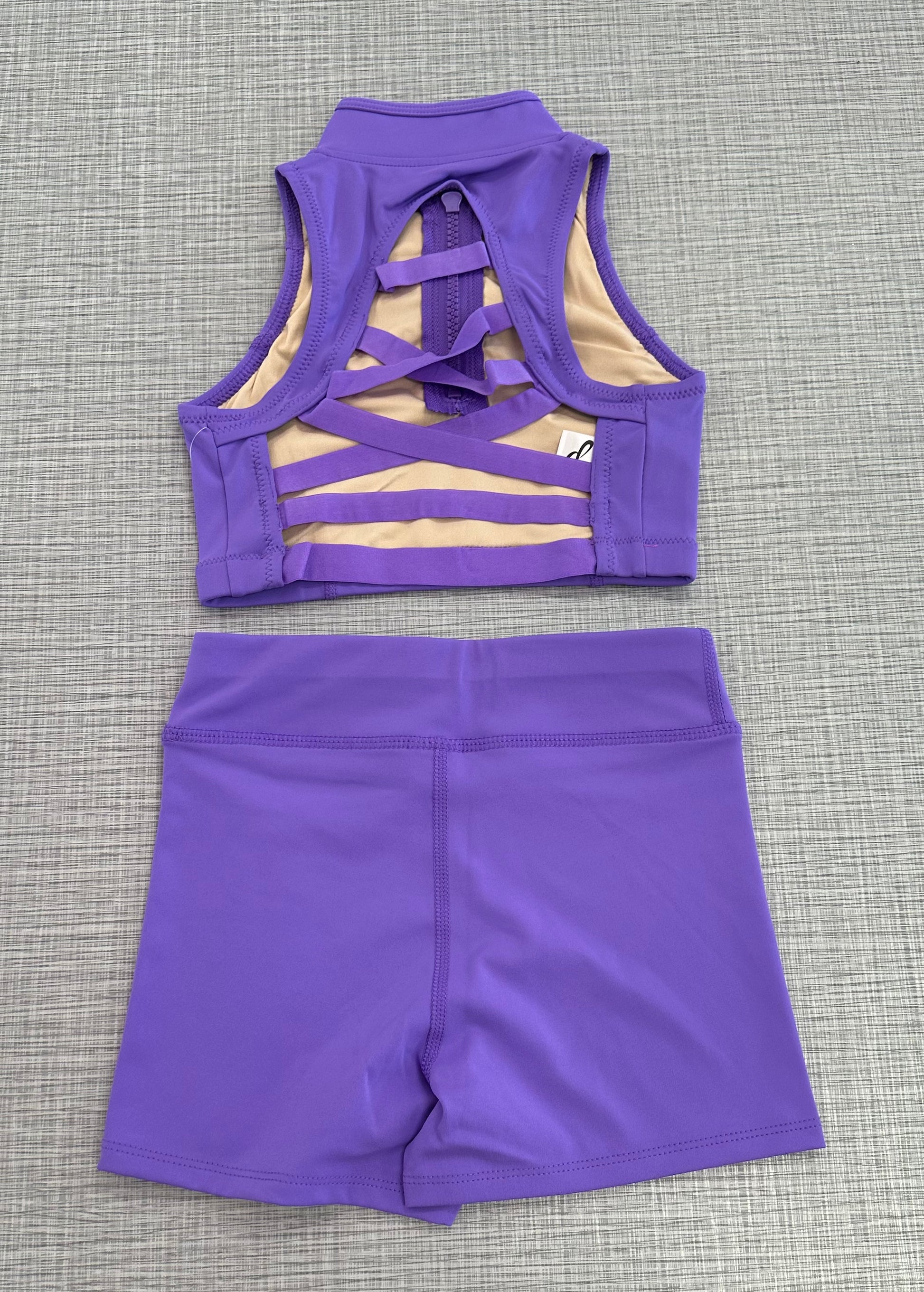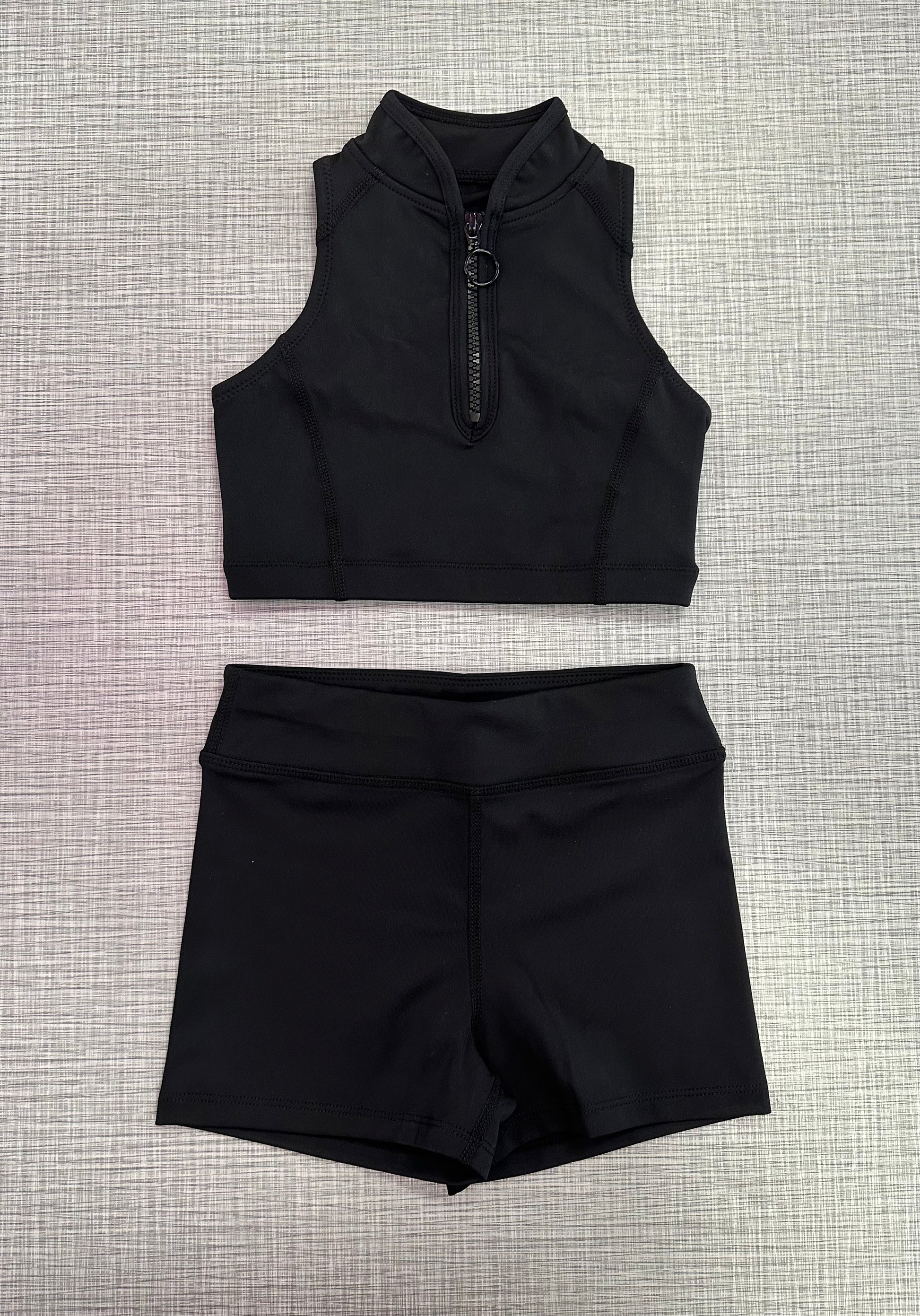 Zip front tank top with elasticized crisscross strap detailing at back. Fully front lined. Polyester/Spandex. Similiar to the old scuba tops.