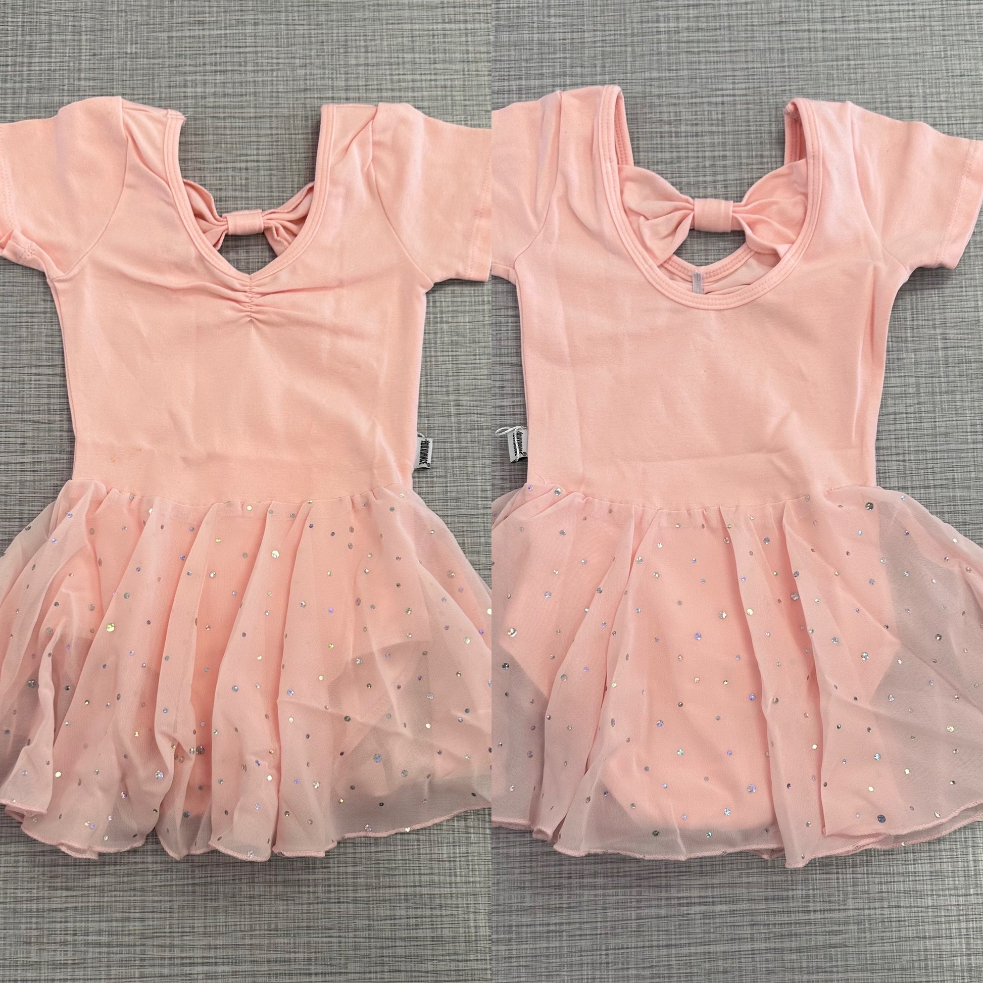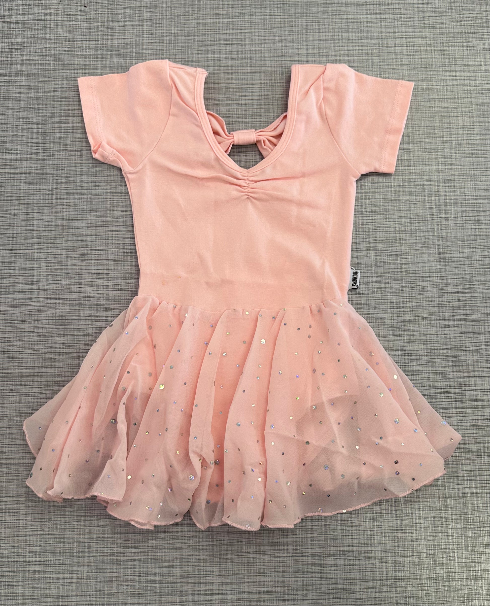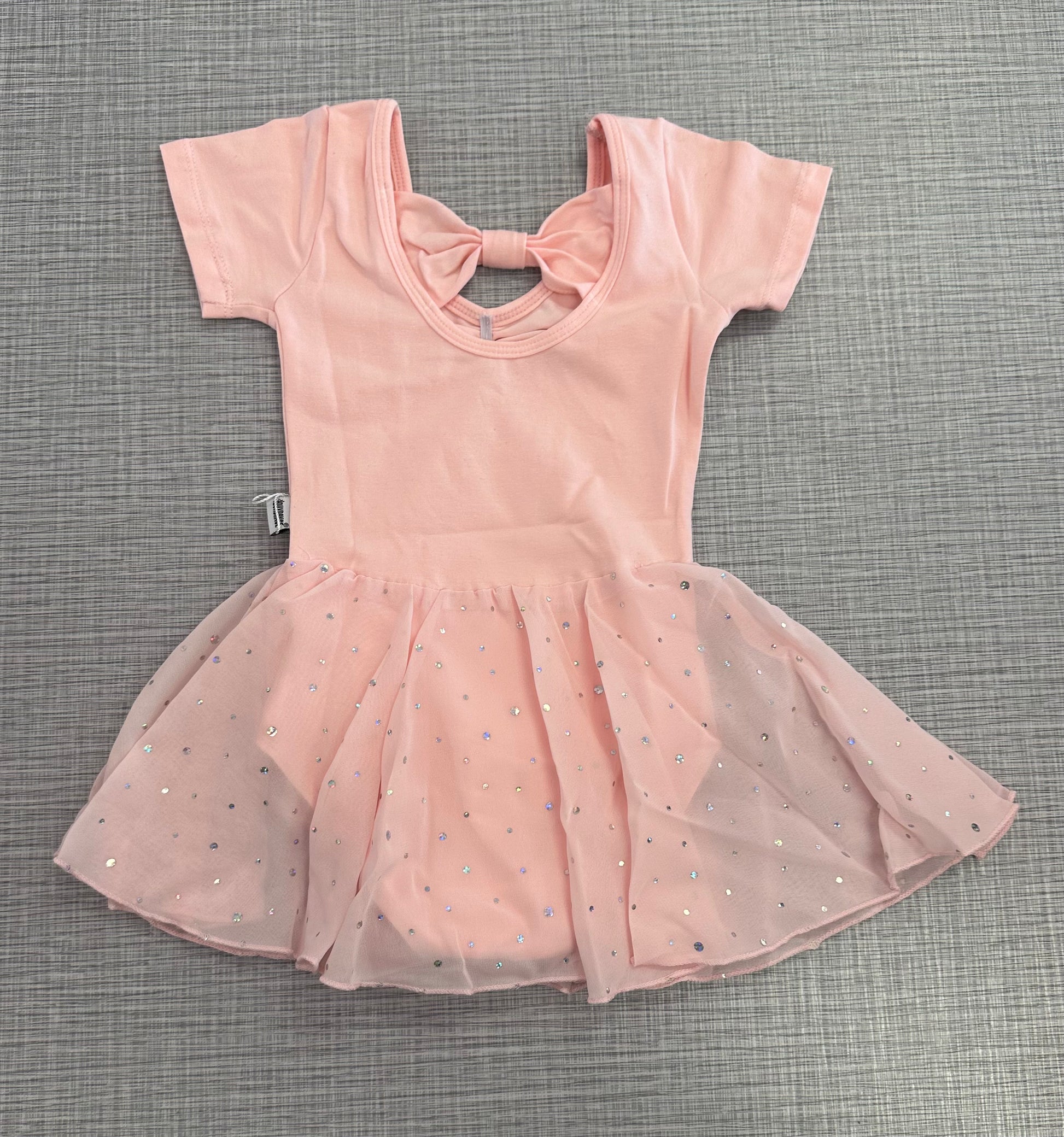 Cap sleeve leotard with a pinch front. The back has a cute bow fabric design. Attached is mesh skirt with sequins. This leotard has a snap crotch making potty training easier.