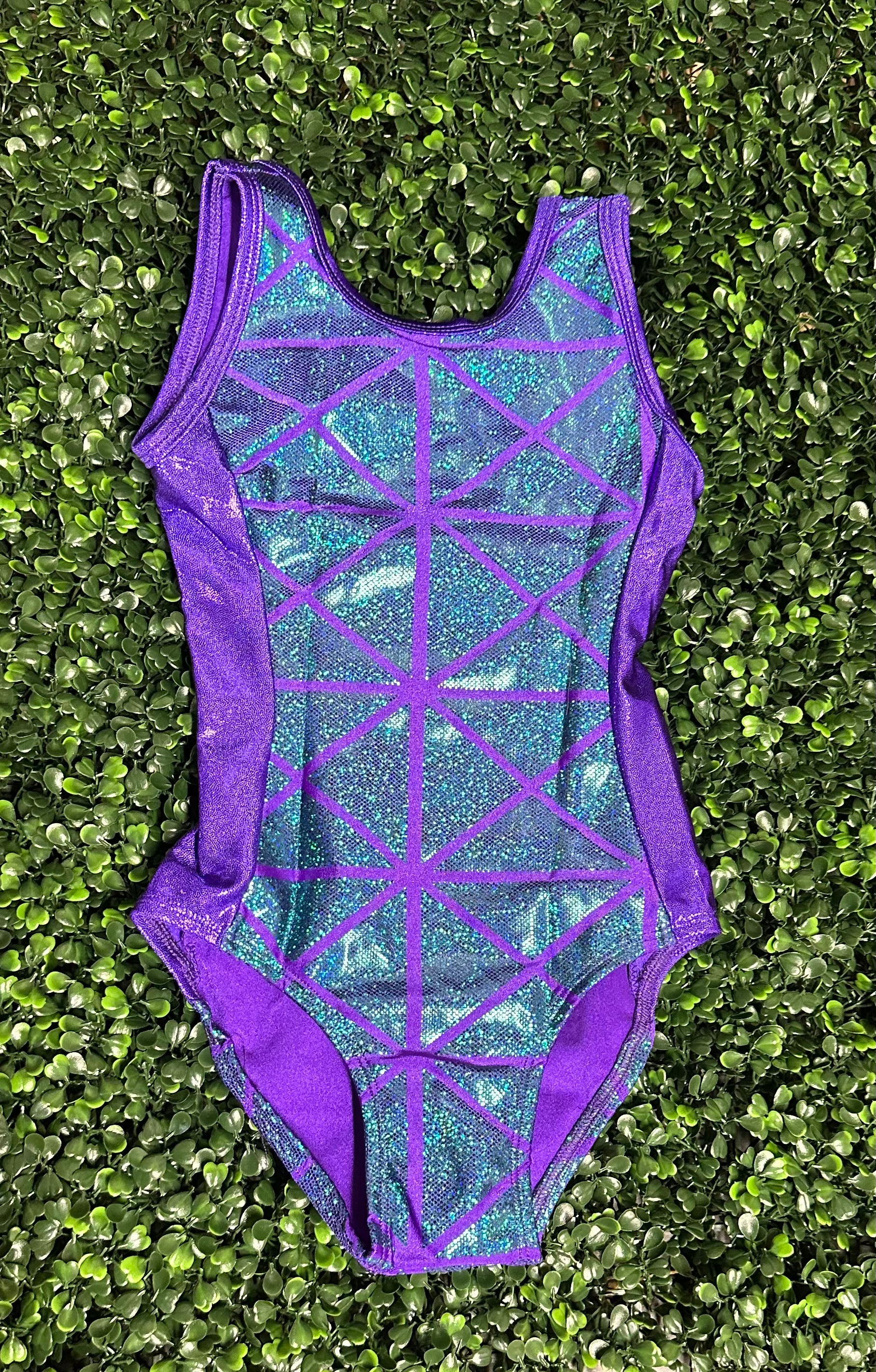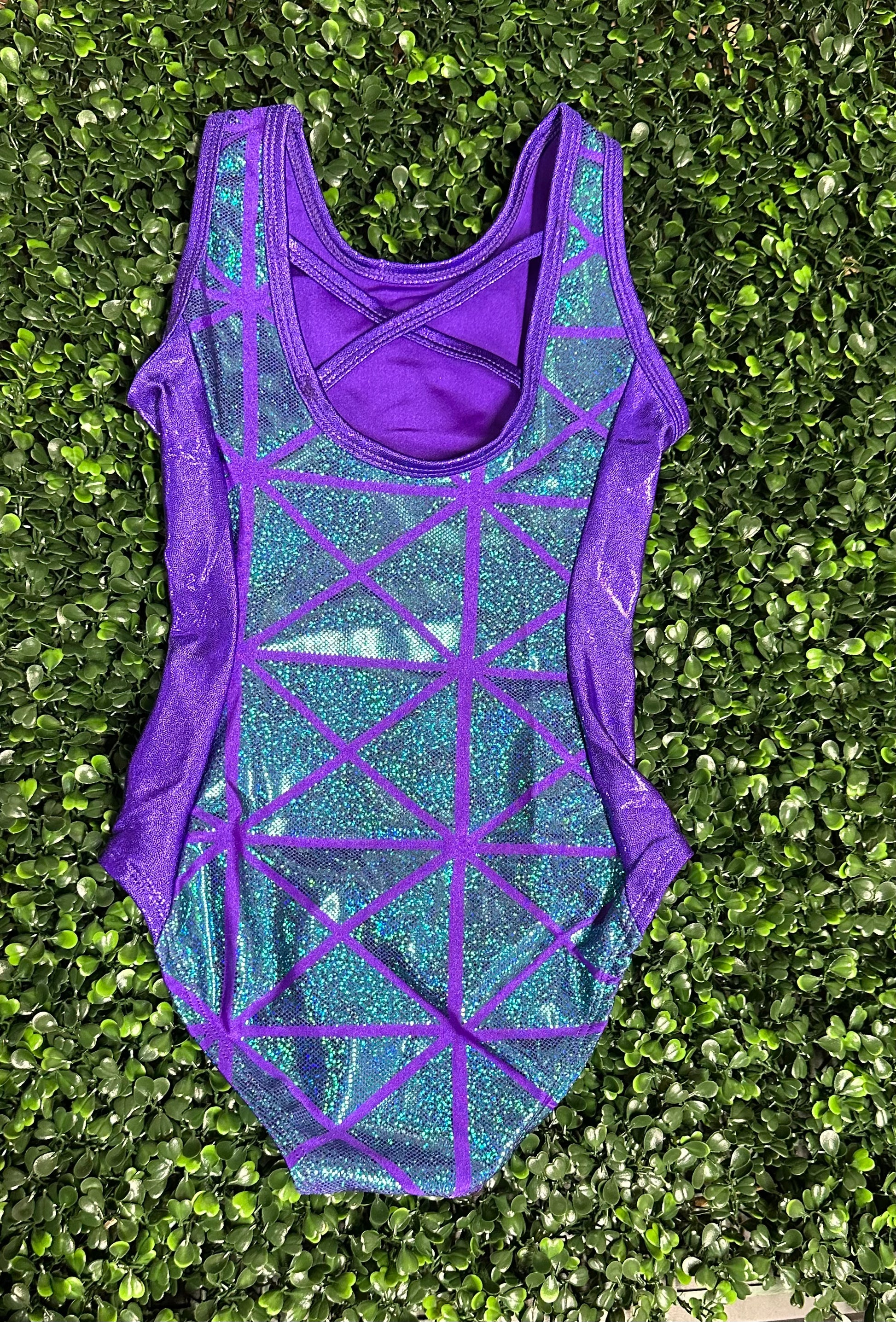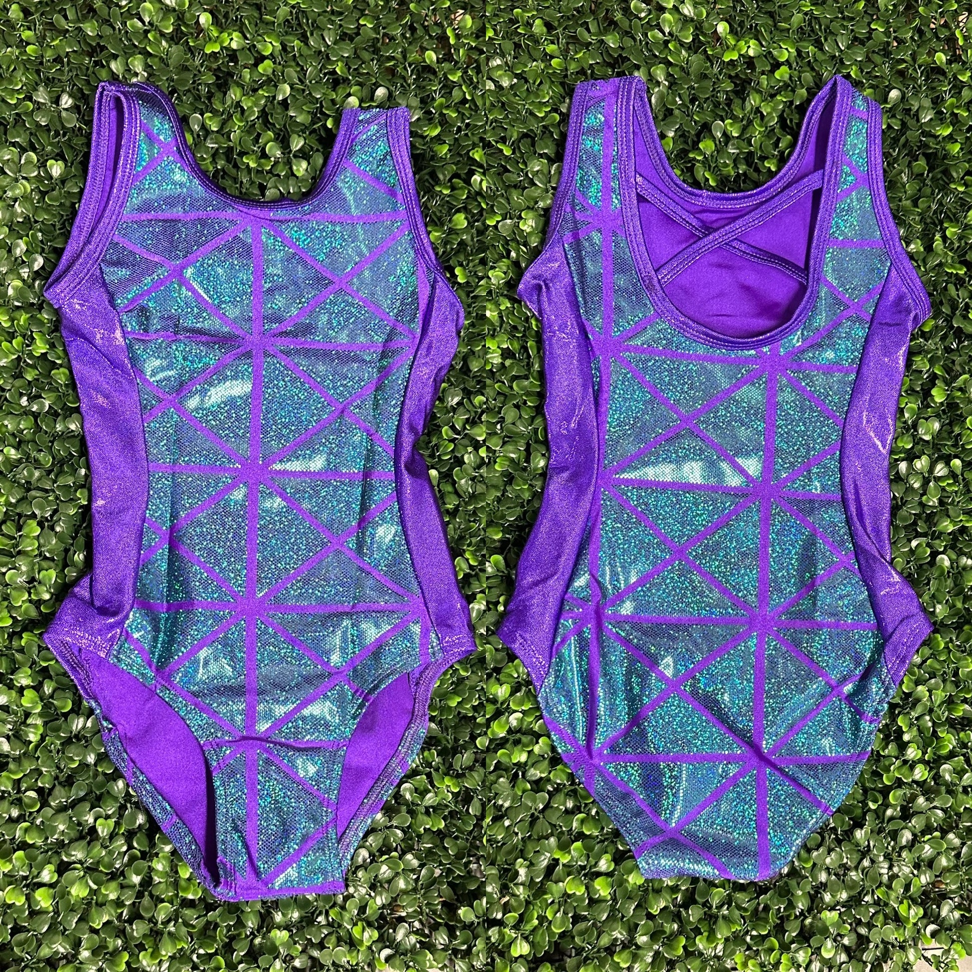 Purple leotard with green color block throughout and purple sides. The back is an x back.