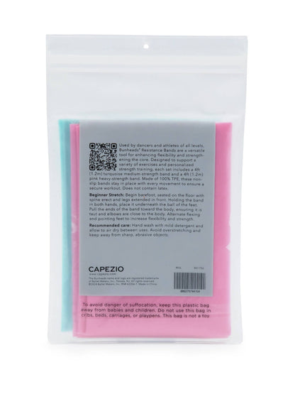 This pack of 100% TPE resistance exercise bands includes two options: one medium-strength turquoise band and one heavy-strength candy pink band. Made from flexible, durable, and non-slip materials, these bands are designed for maximum performance and versatility. Each band measures 4 feet (1.2 meters). Get your full-body workout in by using the bands on your upper body or lower body. Great for stretching and increasing flexibility.