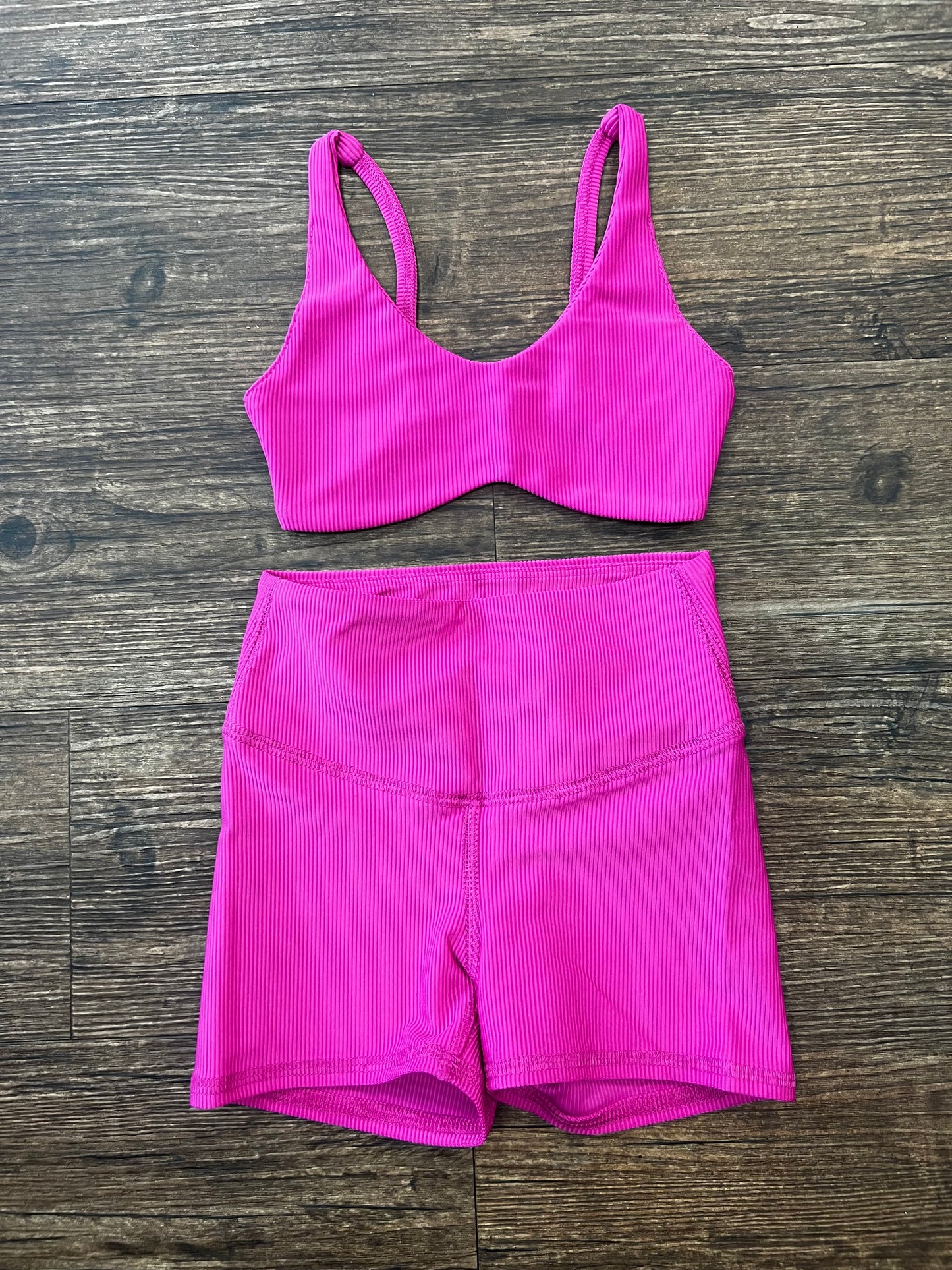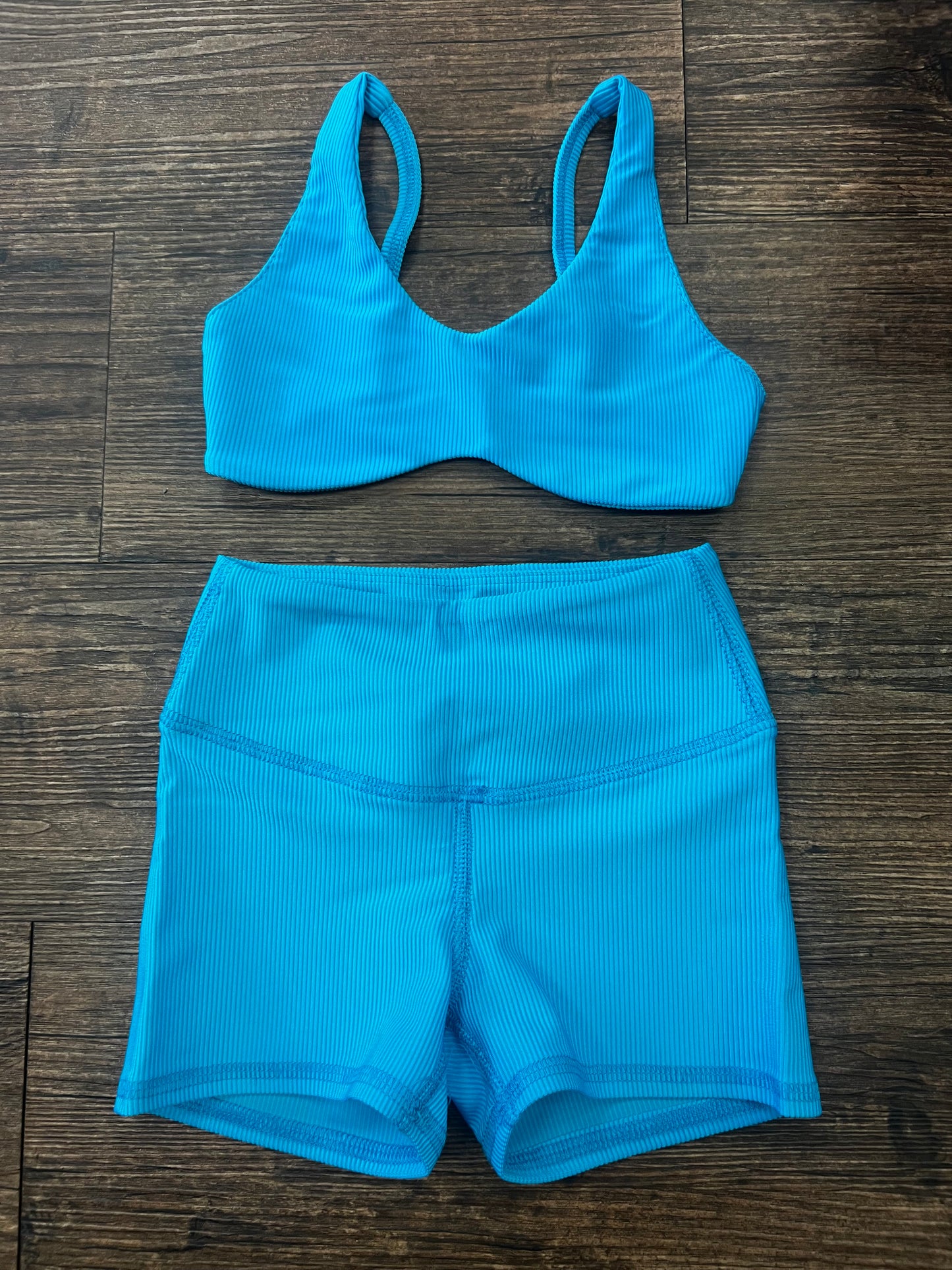 Sizing runs small- similar to TF. Ribbed tank bra top with ribbed high waisted short.