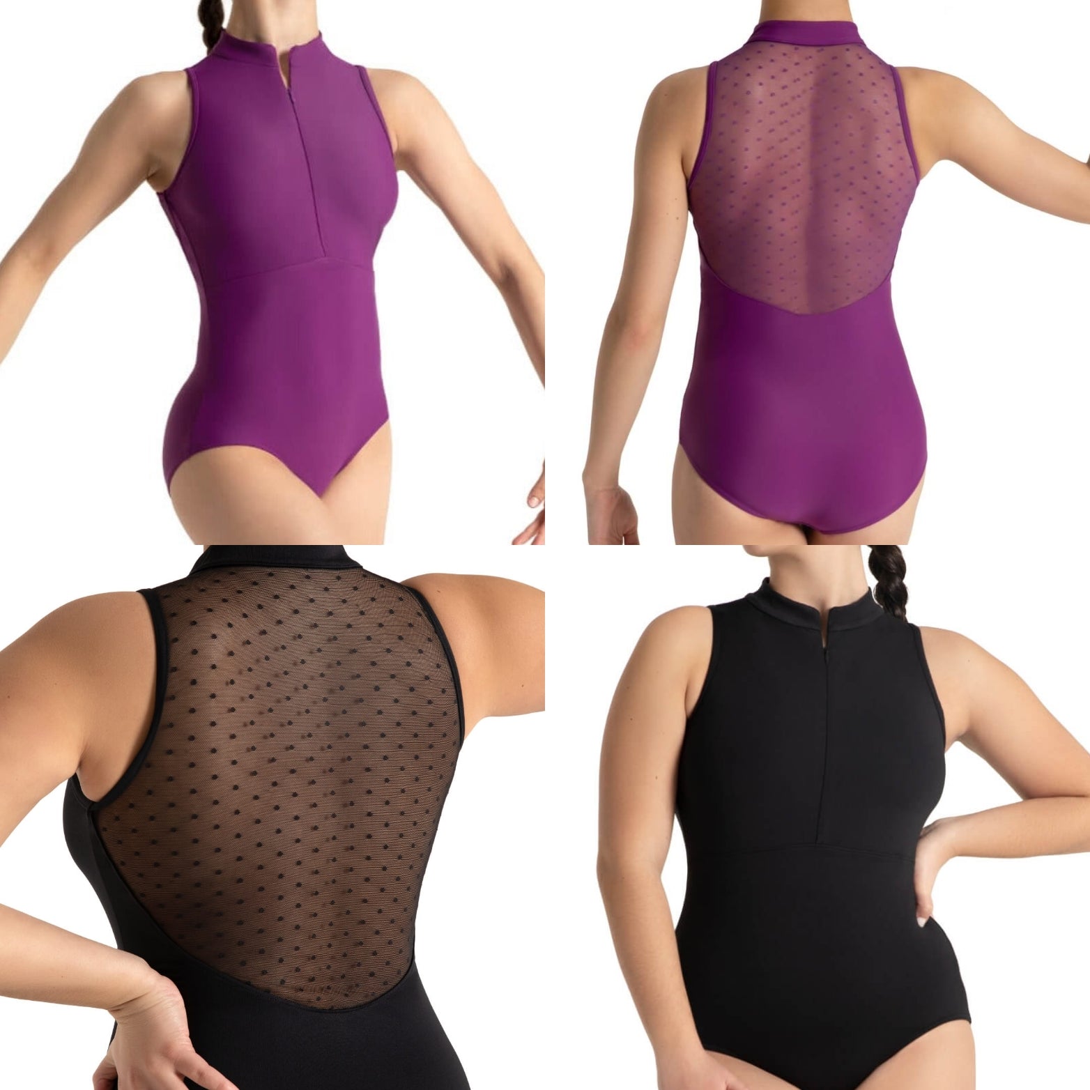Spot On Zip Front Leotard is perfect for every style of dance. This unique leotard boasts a hidden front zipper for easy dressing while remaining sleek and flattering. High front neckline elongates the torso for a clean look. Breathable mesh, polka dot back for a fun added detail.