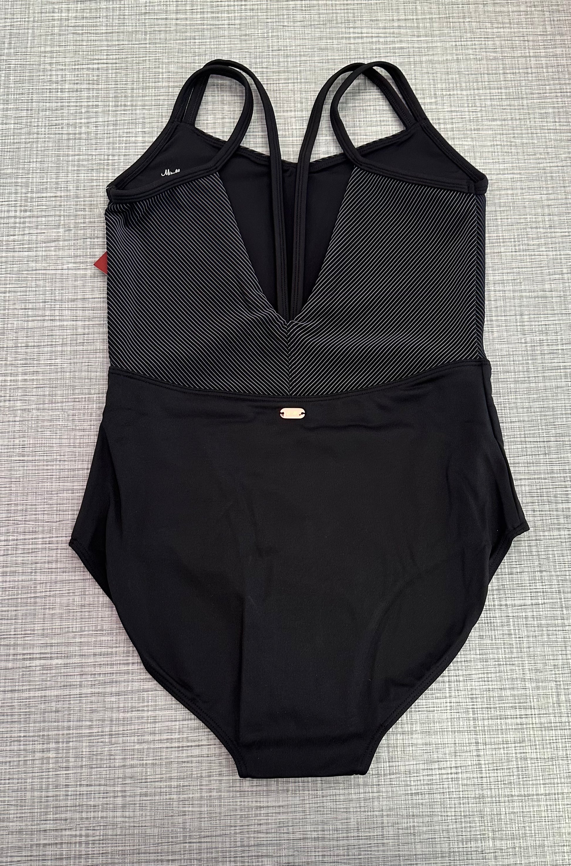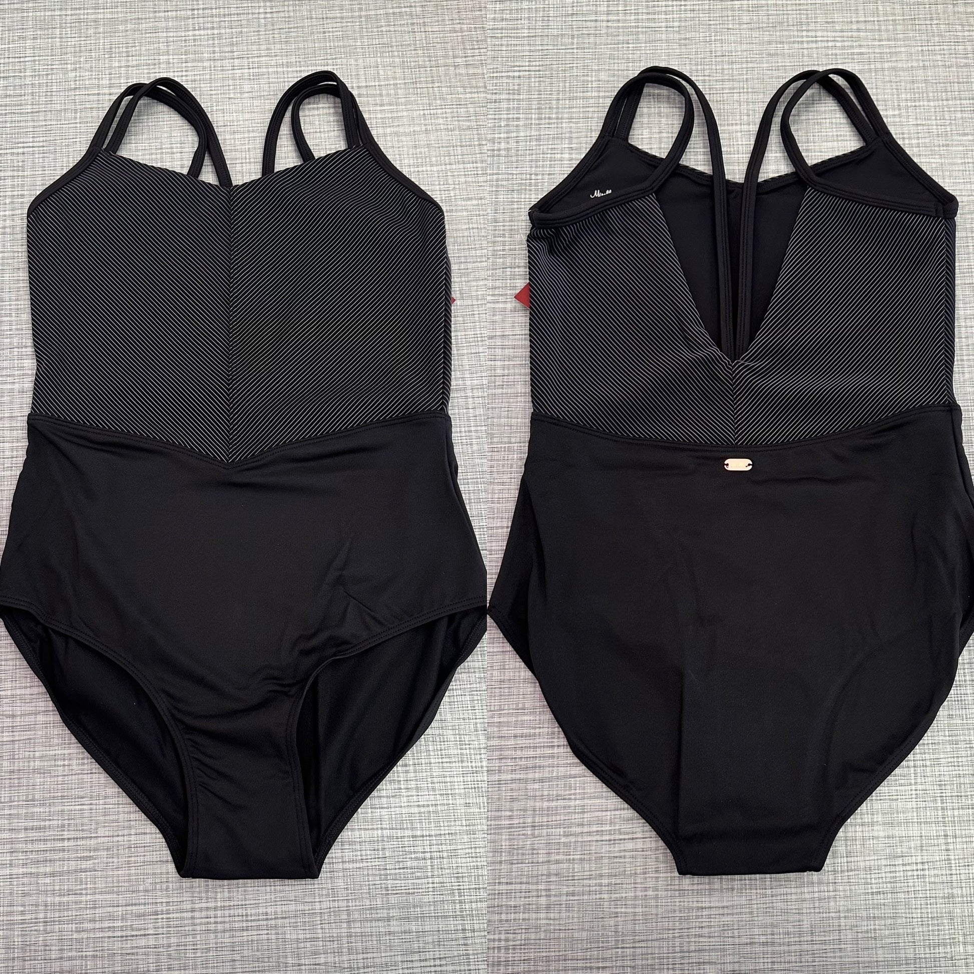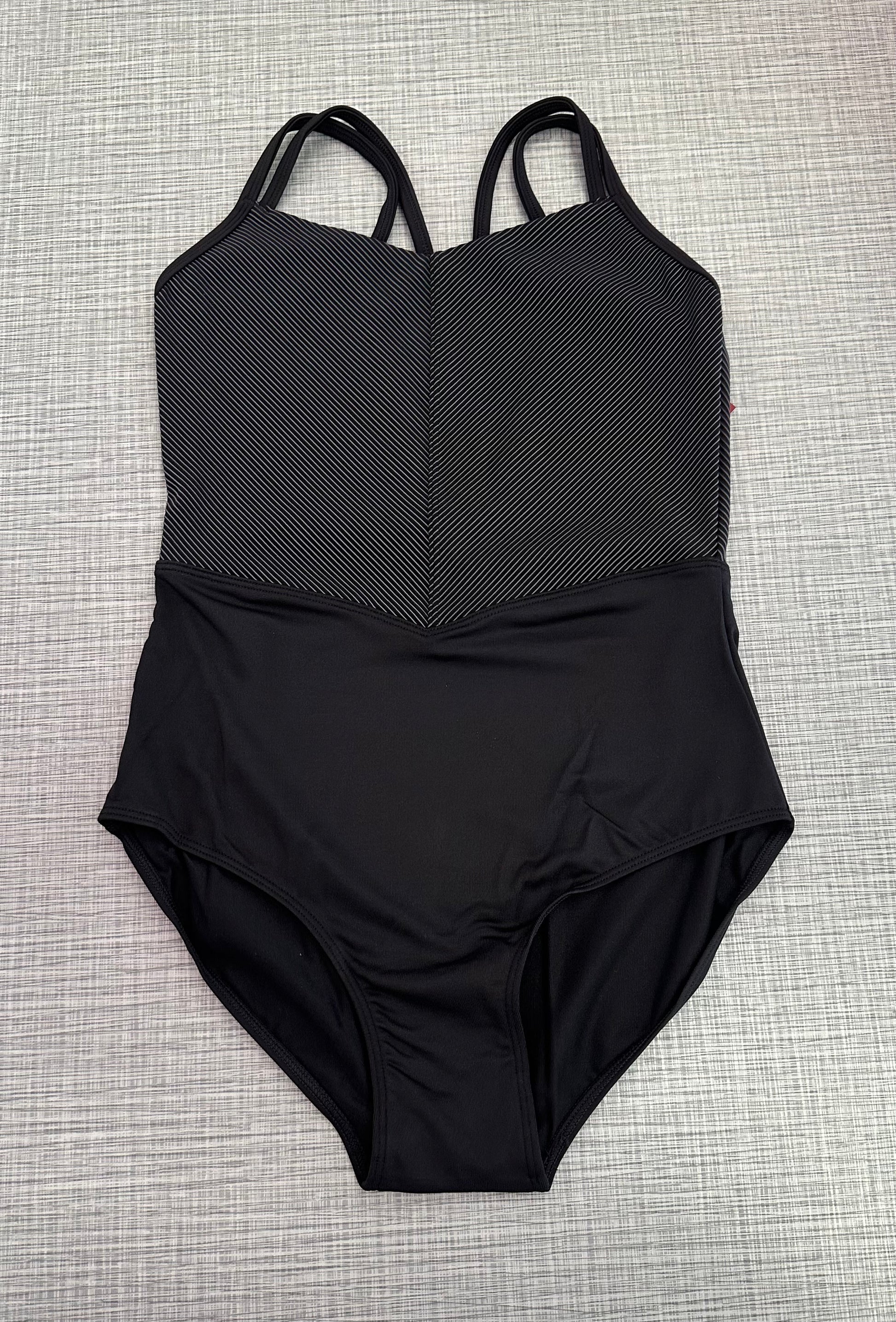 Stripe bodice similar to princess seam. Back offers a double strap,
