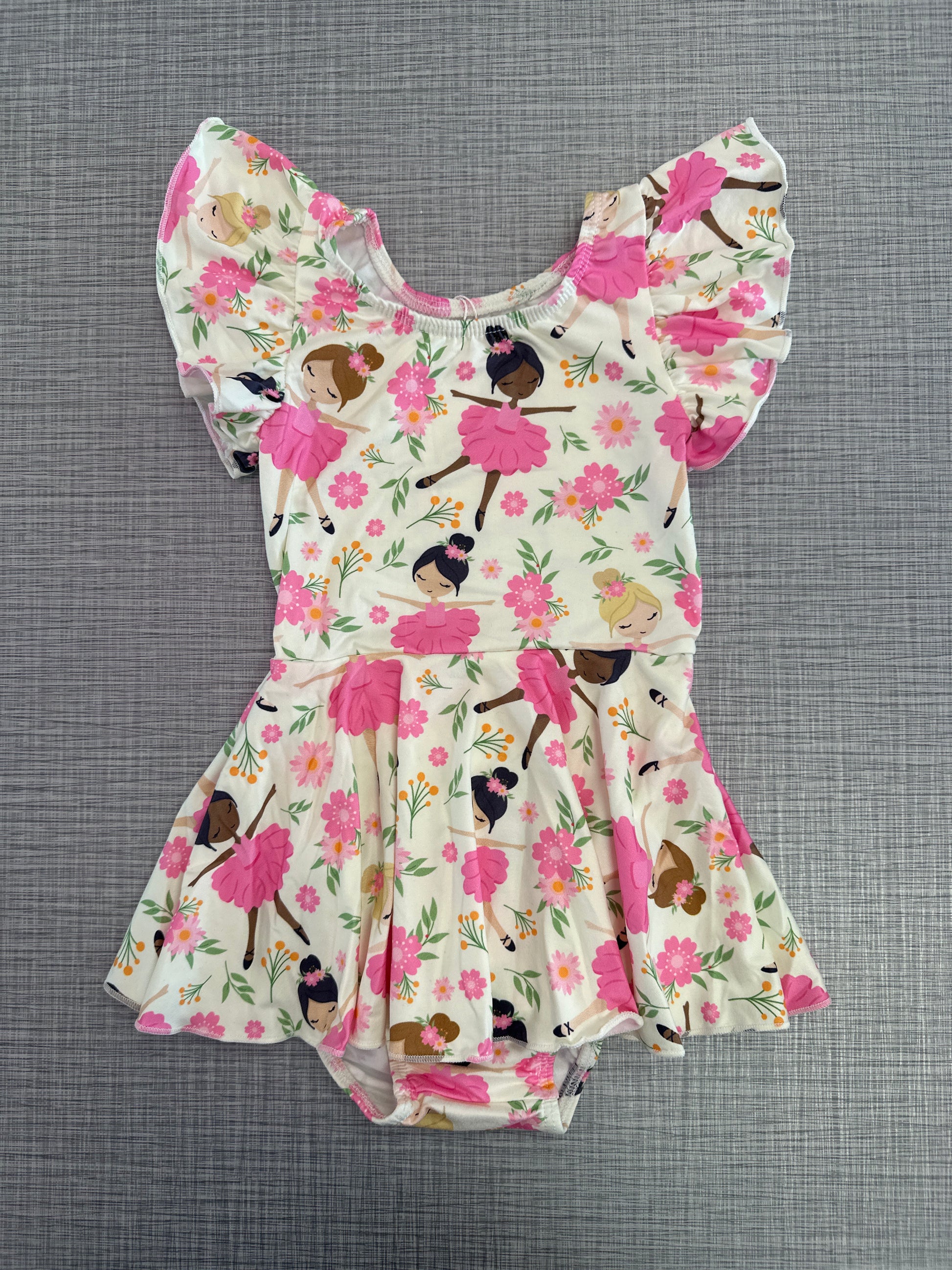 Cream colored leotard withy tiny dancer images in leotards all over. Our leotards are perfect for your tiny ballerina's first dance class.