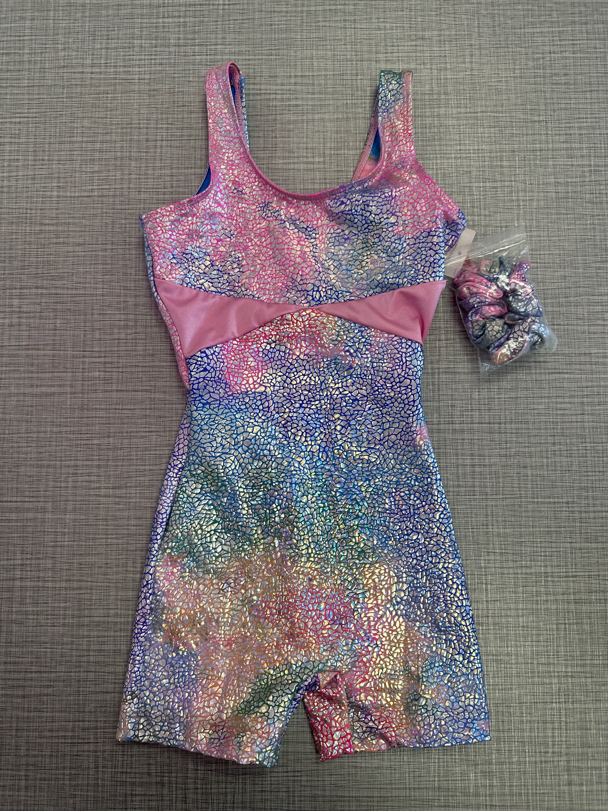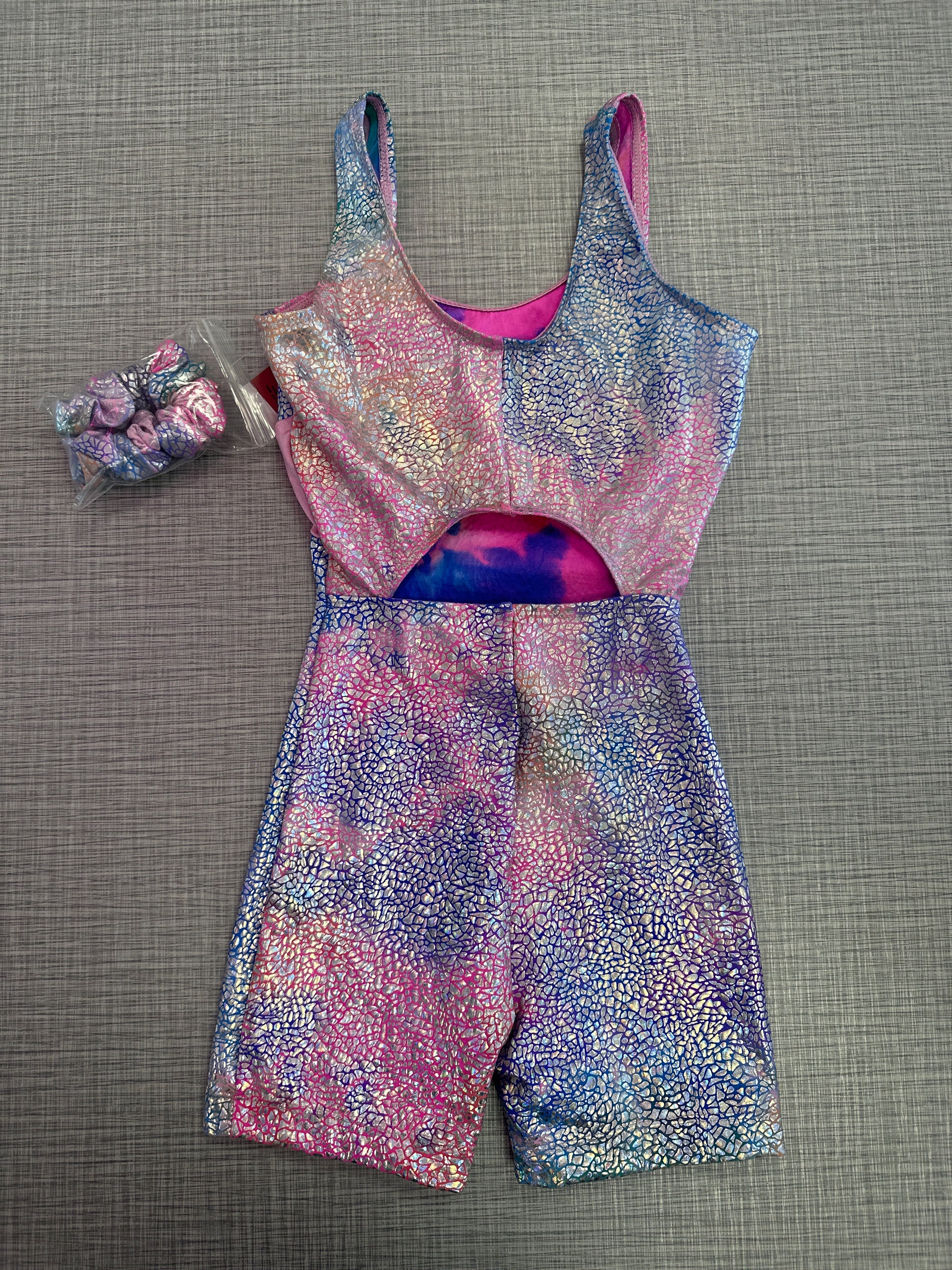 Go for gold in the Stardust Biketard from the limited-edition Unicorn Disco collection. Crafted from a Nylon and Lycra blend, this tank biketard features a scoop front and solid color detail, with a high scoop back and a chic half-circle cutout. Each biketard comes with a matching hair scrunchie, completing the sparkling, playful look for every performance. The tie-dye design ensures each piece is one-of-a-kind. Available in child sizes only.